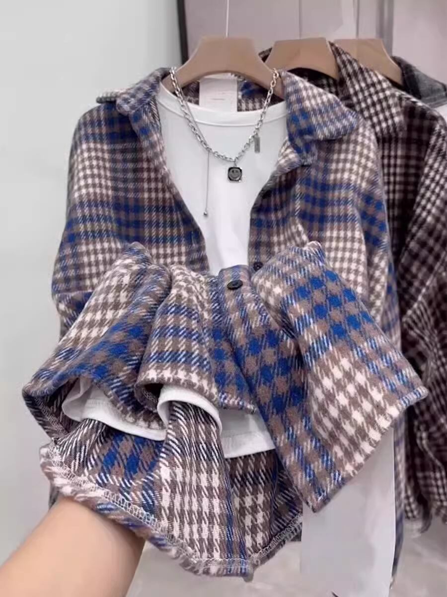 チェック オーバーサイズ ドロップショルダー シャツのご紹介です!今秋冬の必需品として、オシャレでありながら実用性も兼ね備えた一枚です。お尻をカバーする長めの裾とぽわん袖デザインが特徴で、リラックスした雰囲気を演出します。カラーバリエーションも豊富で、ブラック、ブルー、ブラウンの3色をご用意。普段使いや通学、休日のお出かけにぴったりのアイテムです。
