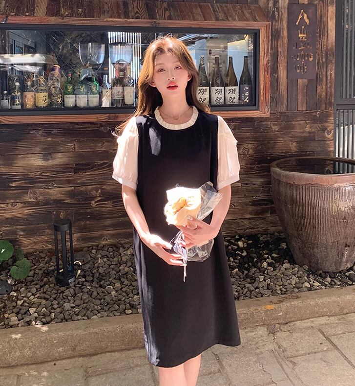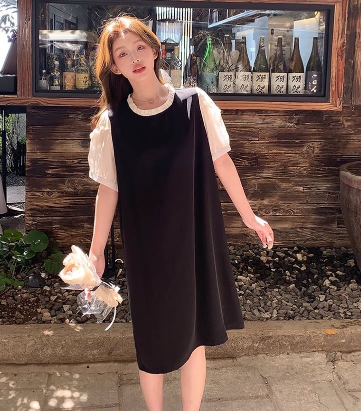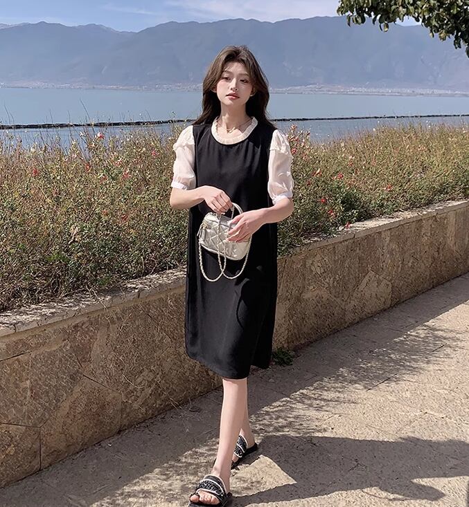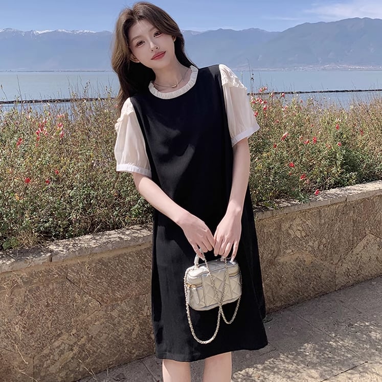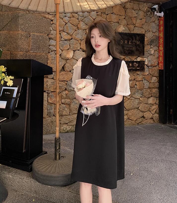 ドッキング ワンピース ブラウス フレアワンピース 春 夏 ひざ丈 半袖 ドロップショルダー フリルカラー スタンドカラー セミフレア 背中空き 落ち感 シフォン 透け感 シースルー シアー ブラック 黒 ベージュ 無地 S M L XL LL 異素材MIX パーティー 式典 ホテル 1枚で決まる 美脚 脚長 高見え スタイルアップ 食事会 冠婚葬祭 かわいい エレガント きれいめ フェミニン 清楚 とろみ感 上品 レディライク 華やか 10代 20代 30代 40代 初対面 合コン コンパ デート