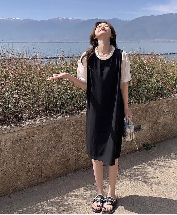 おしゃれに決まる、ドッキングワンピースのご紹介です!春夏にぴったりなシフォン素材で、軽やかかつエレガントなデザインが魅力です。フリルカラーとドロップショルダーが女性らしさを引き立て、セミフレアのシルエットが美脚効果をサポートします。背中が空いているデザインが、さりげない抜け感を演出。1枚で完璧なスタイルを実現!