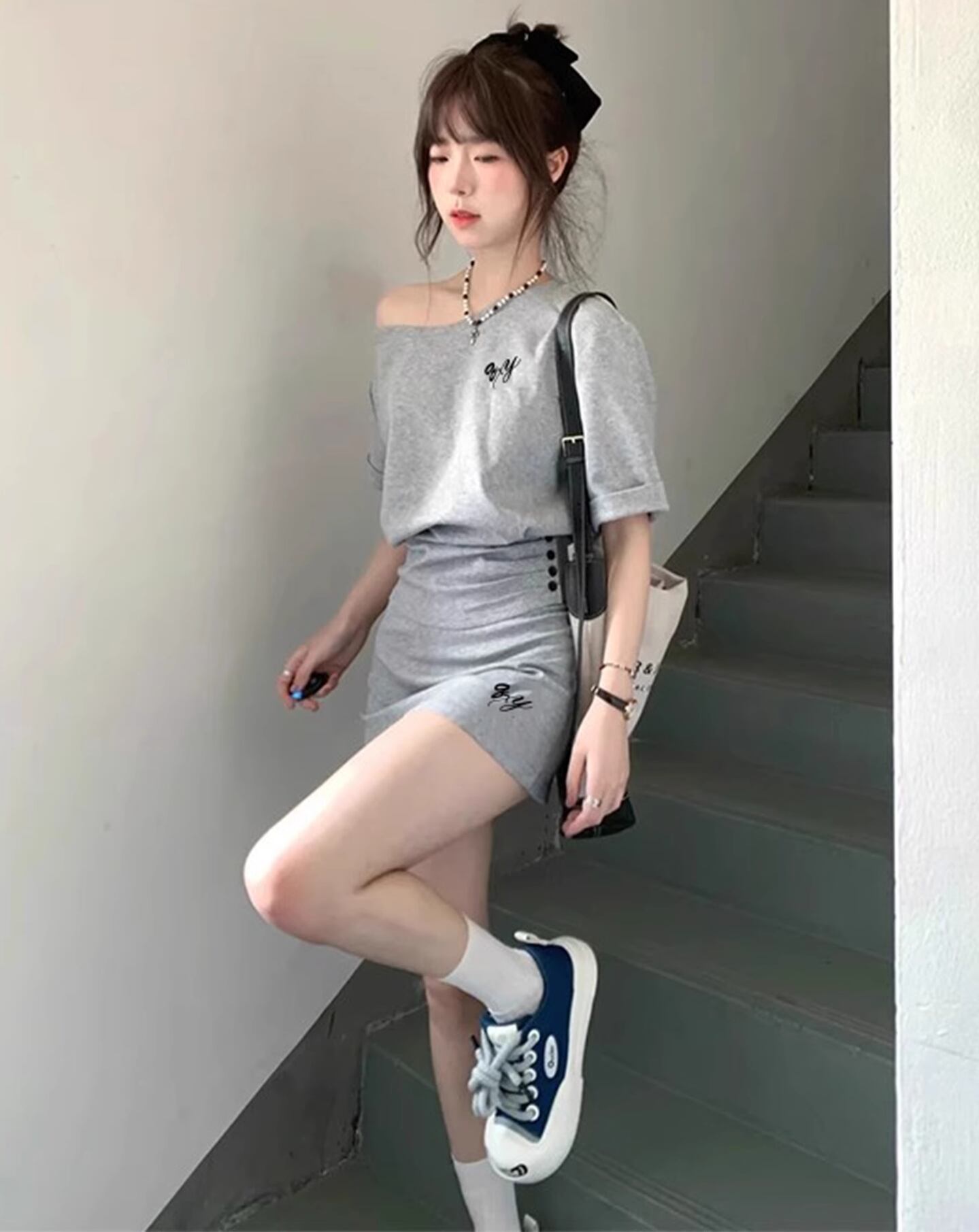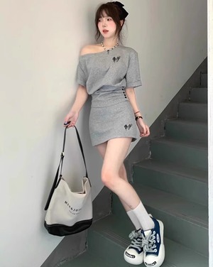 上下セット スウェット カットソー ミニスカート プルオーバー 台形 夏 ミニ ひざ上 普通丈トップス 半袖 ボートネック ワンショルダー デコルテきれい 鎖骨きれい すっきり 肩だし 肌みせ ボタン シャーリング グレー 灰色 無地 英字ロゴ S M L 学校 大学 イベント コンサート ライブ 外出 流行 トレンド 美脚 脚長 若見え 韓国 カジュアル かわいい キュート セクシー クール スポーティ 学生 10代 20代 30代 休日 合コン コンパ 飲み会 通学用 デート お出かけ インスタ映え