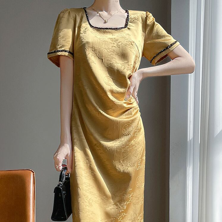 レディース スリム フィット ロング ワンピース オケージョンドレス ワンピドレス 春 夏 ロング丈 半袖 スクエアネック 襟なし ノーカラー Iライン 刺繍 ハリ感 ツヤ感 ブラック 黒 ホワイト 白 ゴールド 柄あり M L XL LL 2XL 3L パーティー 式典 イベント コンサート 体型カバー 1枚で決まる 美脚 脚長 華奢見え 細見え 着痩せ 効果 スタイルアップ エレガント フェミニン アジアン レディライク 華やか 高級感 20代 30代 40代 50代 60代 セレモニー インスタ映