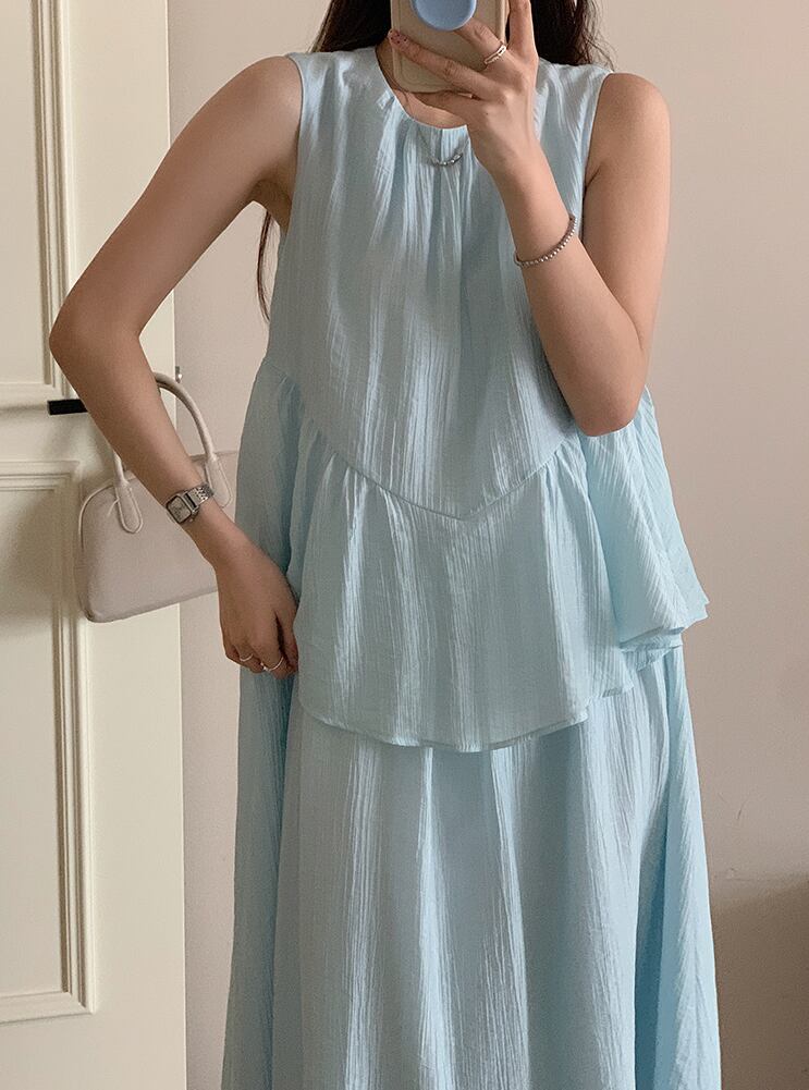 ノースリーブ ワンピース プリーツ シワ感 フェイク ツーピース ワンピドレス フレアワンピース 夏 ロング丈 袖なし 腕出し Uネック デコルテきれい 鎖骨きれい フレア すっきり 肩だし 肌みせ 透け感 淡色 ベージュ ライトブルー 水色 無地 S M L しわ感 リゾート 旅行 外出 体型カバー 1枚で決まる 楽ちん 華奢見え 涼しい 涼感 ナチュラル カジュアル かわいい ガーリー キュート ラブリー エレガント きれいめ 清楚 大人可愛い 爽やか 好感度 10代 20代 30代 40代 デート