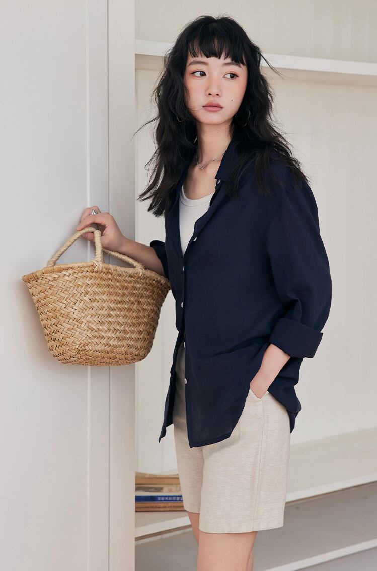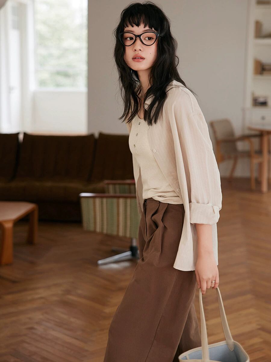 優れた透け感とリネン風の素材感が特徴で、ゆったりとしたシルエットは体型カバーにも最適です。裾が長めのデザインはお尻やポッコリお腹を自然に隠し、清楚で上品な印象を与えます。