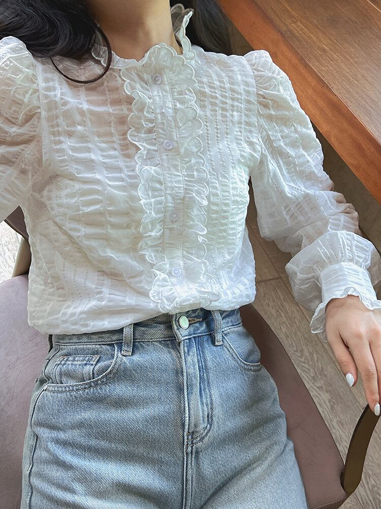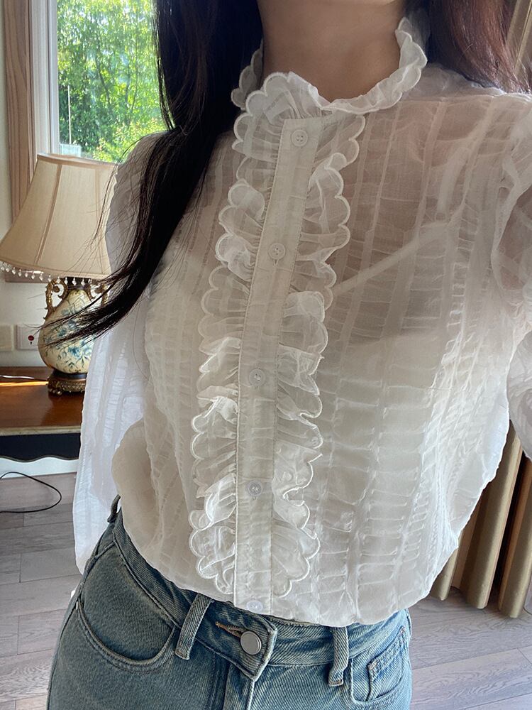 フリル シャツ キャミソール インナー付き 透け感 ブラウス 白シャツ 白トップス 個性的 普通丈トップス 長袖 スタンドカラー レース シースルー シアー 立体的 ポコポコ ホワイト 白 無地 S M L 薄手 学校 大学 パーティー 外出 流行 トレンド 普段使い 日常使い 着回し デイリー 合わせやすい ナチュラル カジュアル かわいい ガーリー キュート フェミニン おしゃれ こなれ感 華やか 10代 20代 30代 40代 女子会 休日 合コン コンパ 飲み会 通勤用 通学用 インスタ映え