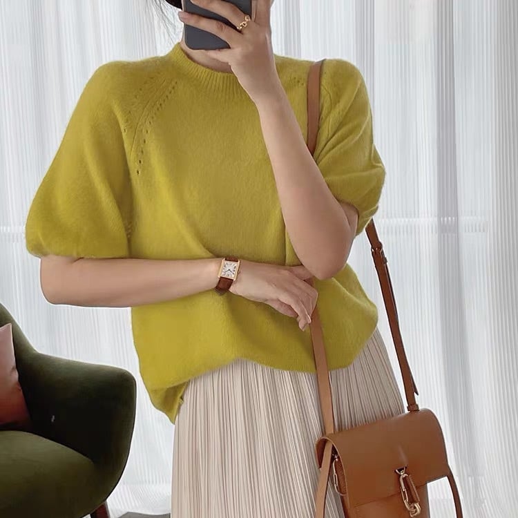レディース ニット 半袖 セーター 春 夏 パフスリーブ クルーネック 丸首 襟なし 刺繍 ふわふわ 編み込み イエロー 黄色 無地 ゆったり フリーサイズ サマーニット オフィス 学校 大学 職場 リゾート 旅行 外出 仕事 体型カバー 1枚で決まる 流行 トレンド 普段使い 日常使い 楽ちん 若見え デイリー 合わせやすい お宅訪問 ご挨拶 ベーシック シンプル ナチュラル カジュアル かわいい きれいめ ママ 学生 10代 20代 30代 40代 50代 休日 通勤用 通学用 デート お出かけ