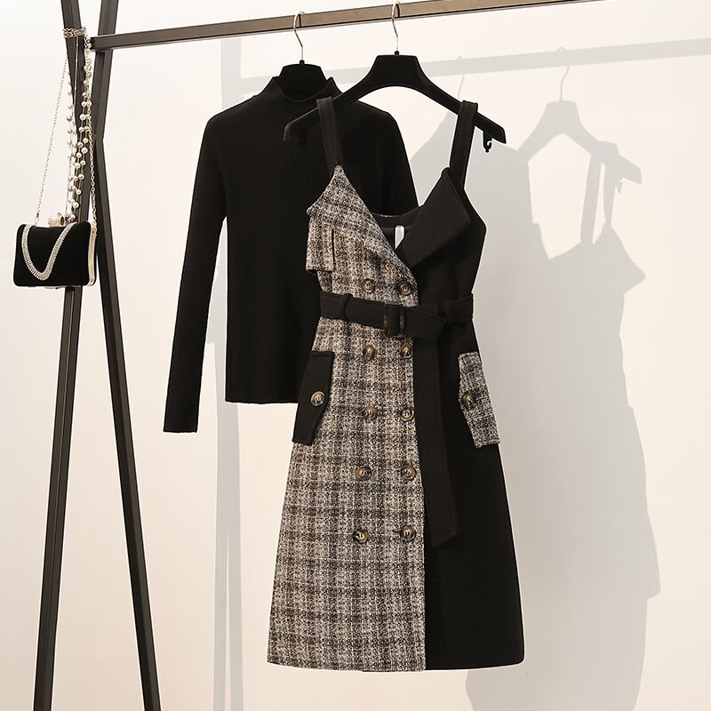 レトロ風 ワンピース セットアップ 2点セット 長袖 ノースリーブ 秋冬 かわいい Aライン ジャンパースカート 膝下 ハイネック タートルネック 切り替えデザイン ドッキング ベルト ウエストマーク 2way 伸縮性 黒 ブラック M L XL 2XL 3XL 4XL 大きいサイズ 大きめ ビッグサイズ かわいい 大人可愛い きれいめ カジュアル 大人 上品 おしゃれ レトロ 無地 チェック柄 普段使い キュート ガーリー 個性的 エレガント 通勤 学生 通学 デート 10代 20代 30代 ニット