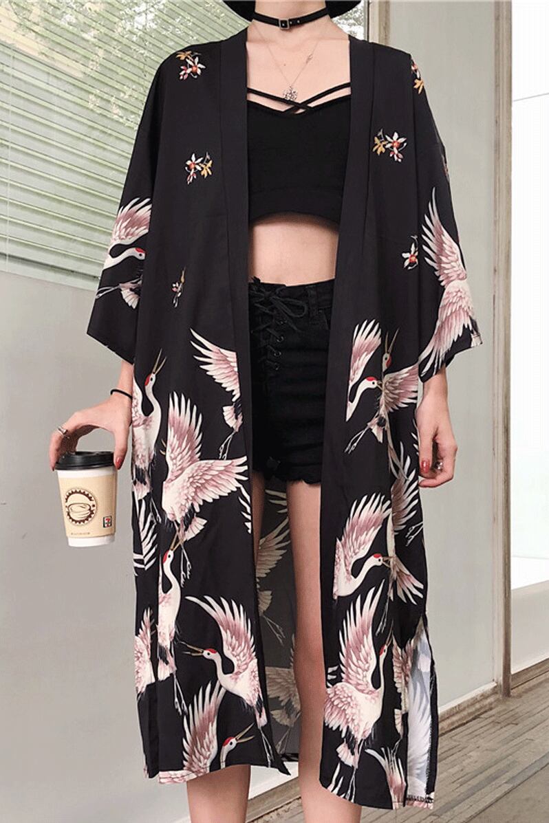 トップス カーディガン レディース 春夏 カジュアル ゆったり 長袖 膝上 ミモレ丈 ミディアム丈 ミドル丈 ボリューム袖 襟なし 前開き 黒 ブラック 大人カラー ワンサイズ フリーサイズ 大人可愛い きれいめ 大人 おしゃれ レトロ アジアン エキゾチック リラックス 日本風 ジャパン 着物風 柄 花柄 アニマル柄 鳥 バード柄 鶴 防寒 体型カバー 10代 20代 30代 40代 50代 こなれ感 ラフ ルーズ 個性的 クール セクシー モダン 主役級 存在感 イベント リゾート 旅行 海