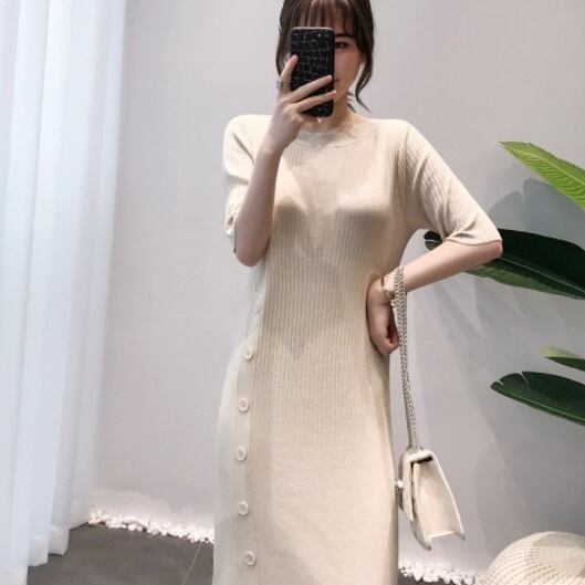 2色 ワンピース 半袖 春夏 きれいめ ロング ニット ワンピ ワンピドレス タイトワンピース 膝下 ミモレ ミモレ丈 7分丈 ミディアム丈 ミドル丈 五分袖 Uネック ラウンドネック 襟なし スリム タイト 細身 ストレート スリット サイドスリット ボタン 白 ホワイト 黒 ブラック 大人カラー モノトーン 春カラー ワンサイズ ジャスト かわいい 大人可愛い きれいめ シンプル カジュアル 大人 上品 おしゃれ ナチュラル かっこいい エキゾチック リラックス 無地 韓国 韓国系 オルチャン