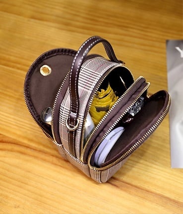 小さなバッグながらたくさんの収納がついたチェック柄のショルダーバッグ。