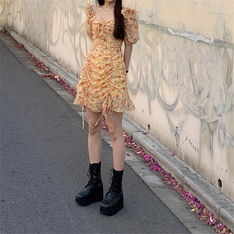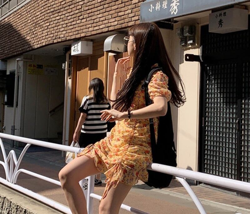 レトロ風 ワンピース 半袖 春夏 タイトワンピース ミニ ミニ丈 ショート ショート丈 膝丈 ひざ丈 膝上 ぽわん袖 スクエアネック スリム タイト 細身 バックシャン バックコンシャス 背中魅せ フリル リボン 黄色 イエロー 春カラー S M L XL 小さいサイズ 大きいサイズ かわいい 大人可愛い おしゃれ ナチュラル アジアン エスニック エキゾチック リラックス 花柄 小花柄 フラワー 韓国 韓国系 オルチャン 韓国ファッション コーデ モテ 美脚 脚長 普段使い こなれ感 ラフ ラブリー