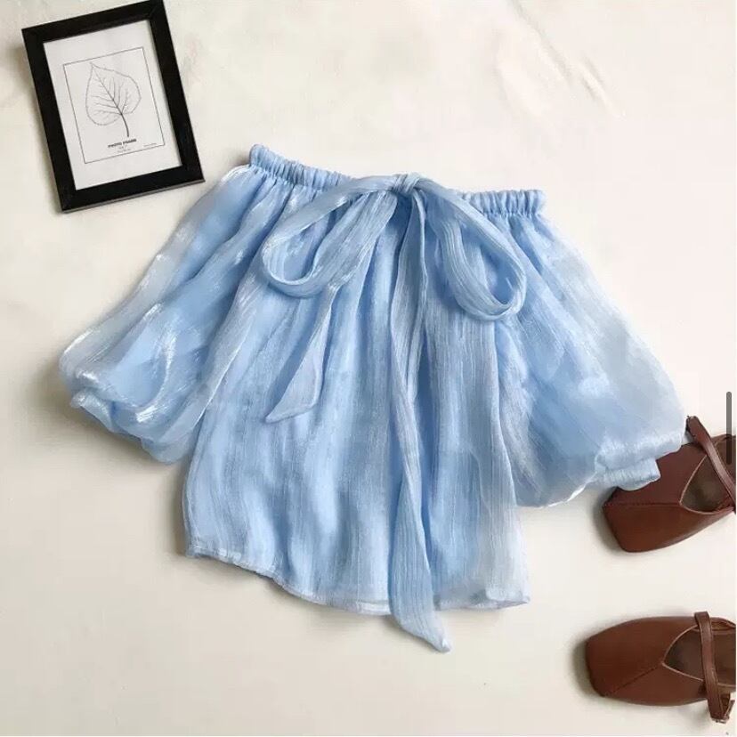 7色 トップス カットソー レディース 春夏 かわいい ゆったり 五分袖 パフスリーブ ドロップショルダー オフショルダー オフショル シフォン リボン ふわふわ 透け感 シースルー ホワイト ブラック ブルー グレー ベージュ ピンク ネイビー ワンサイズ かわいい 大人可愛い きれいめ シンプル 大人 上品 おしゃれ 無地 韓国 コーデ スタイル 着回し モテ 体型カバー トレンド インスタ映え こなれ感 キュート ガーリー セクシー エレガント 主役級 存在感 とろみ感 抜け感 デート お出かけ