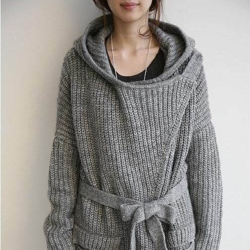 カーディガン レディース アウター ジャケット ロング丈 ベルト フード ニット 長袖 コーディガン セーター グレー ワンサイズ フリーサイズ 秋 冬 ウエスト リボン 厚い 秋冬 ストリート ルーズ フィット 大人女子 きれい 清楚 エレガント 上着 大人可愛い 通勤