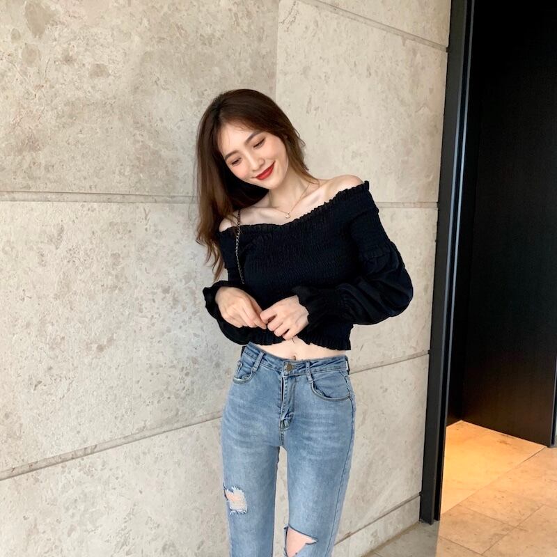 大胆に開いたネックラインと、へそ出しルックがとてもセクシーなレディースシャツ。