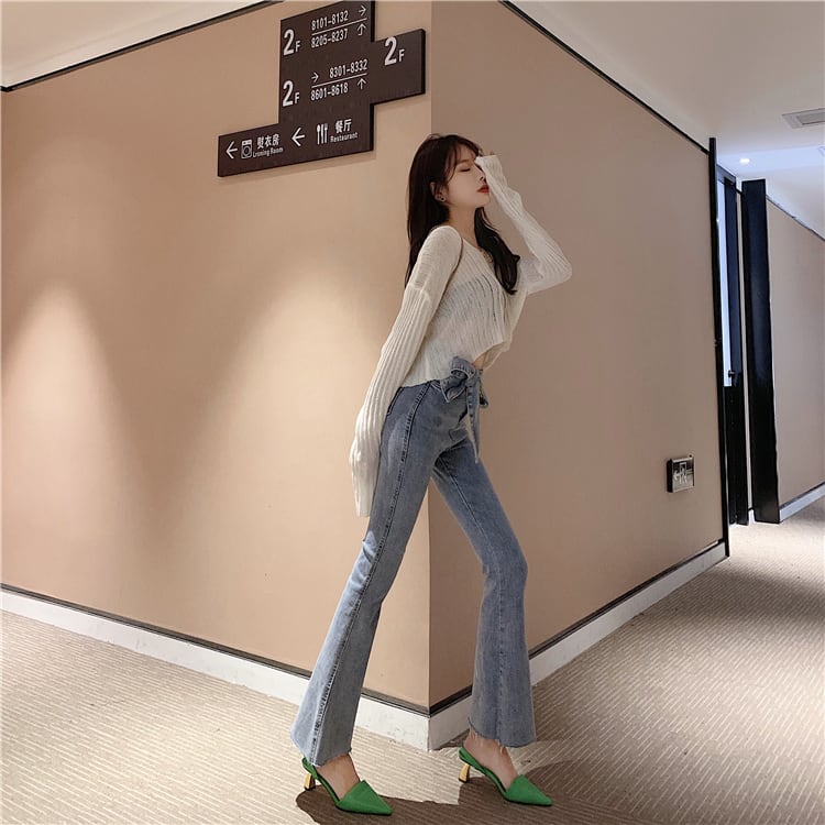 ウエストのリボンがアクセントとなるスキニーパンツ。