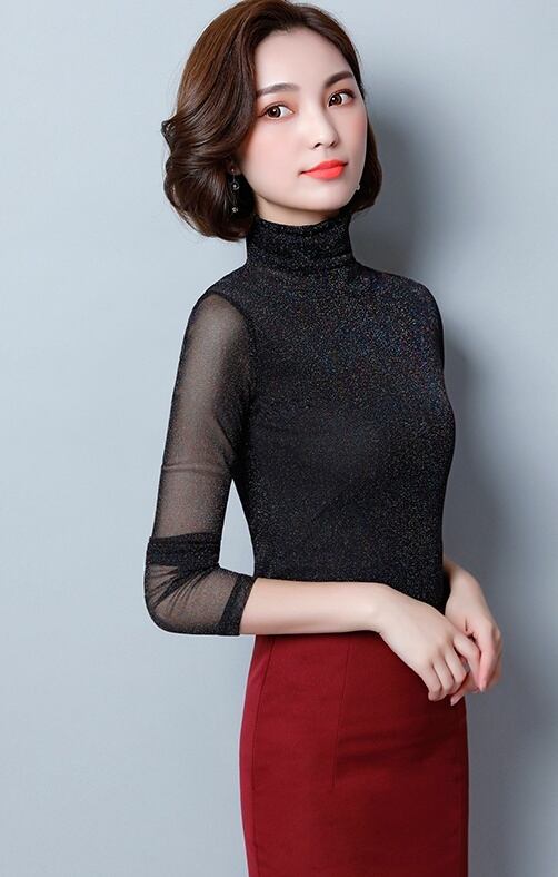 4色 トップス Tシャツ シャツ プルオーバー レディース 春夏 きれいめ 長袖 ハイネック スリム タイト 細身 ストレート 切り替えデザイン ドッキング 透け感 シースルー プルオーバー 黒 ブラック 青 ブルー オレンジ ワインレッド 大人カラー M L XL 2XL 3XL 大きいサイズ 大きい ビッグサイズ ジャスト かわいい 大人可愛い きれいめ シンプル カジュアル 大人 上品 おしゃれ ナチュラル かっこいい レトロ アジアン エスニック エキゾチック リラックス フェミニン 無地 韓国