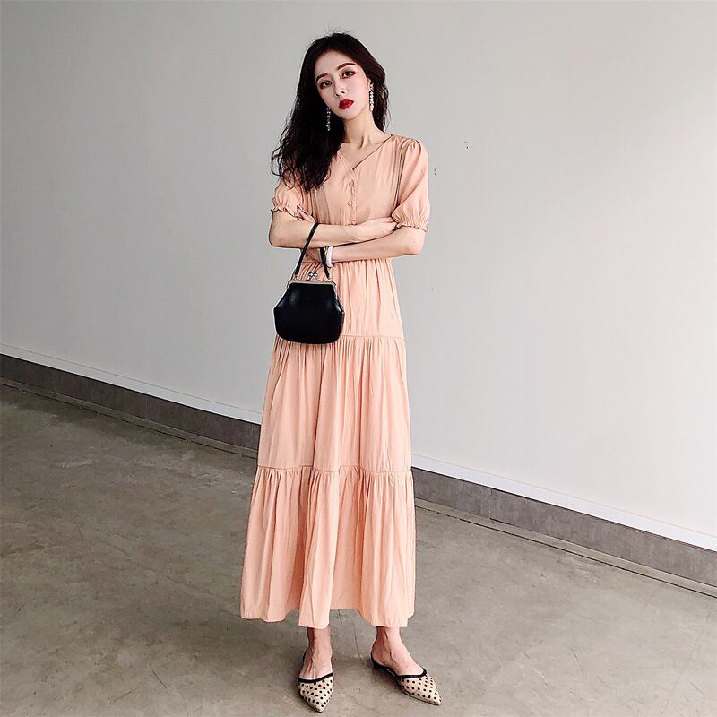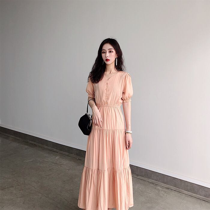 レトロ風 ワンピース 半袖 春夏 きれいめ ロング aライン aライン Aライン フレア ロング ロング丈 マキシ マキシ丈 9分丈 アンクル丈 袖コンシャス パフスリーブ Vネック 襟なし フレア セミフレア ウエストマーク ピンク 大人カラー 春カラー S L 小さいサイズ 大きいサイズ ゆったり ゆる かわいい 大人可愛い きれいめ シンプル カジュアル 大人 上品 おしゃれ ナチュラル かっこいい レトロ アジアン エスニック エキゾチック リラックス フェミニン 無地 韓国 韓国系 オルチャン
