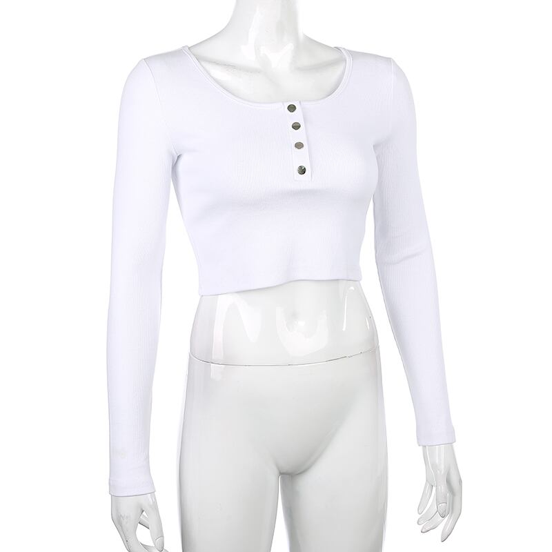 2色 トップス Tシャツ シャツ ブラウス プルオーバー レディース 春 秋 カジュアル ミニ ショート ショート丈 ミニ丈 へそ出し 長袖 パフスリーブ 萌袖 Uネック ラウンドネック タイト 細身 プルオーバー ボタン 白 ホワイト 黒 ブラック 大人カラー モノトーン 春カラー 秋カラー S M L 小さいサイズ 大きいサイズ ジャスト かわいい 大人可愛い きれいめ シンプル カジュアル 大人 上品 おしゃれ ナチュラル かっこいい エキゾチック リラックス 無地 韓国 韓国系 オルチャン