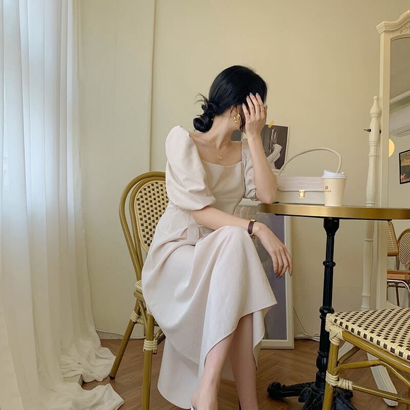 2色 ワンピース 半袖 春夏 きれいめ ロング aライン マキシ aライン Aライン フレア ロング ロング丈 マキシ マキシ丈 五分袖 七分袖 ぽわん袖 ボリューム袖 ボリュームスリーブ 袖コンシャス スクエアネック 襟なし フレア セミフレア Aライン 黒 ブラック くすみカラー 大人カラー アプリコット S M L XL 小さいサイズ 大きいサイズ ゆったり ゆる かわいい 大人可愛い きれいめ シンプル カジュアル 大人 上品 おしゃれ ナチュラル かっこいい レトロ アジアン エスニック