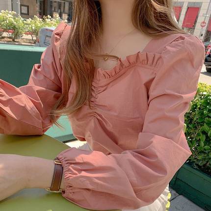 3色 トップス ブラウス プルオーバー レディース 春夏 きれいめ 長袖 ボリューム袖 スクエアネック タイト フリル 色展開 ブルー ピンク アプリコット S M L XL かわいい 大人可愛い きれいめ シンプル カジュアル 上品 おしゃれ 無地 コーデ スタイル 着回し モテ 10代 20代 30代 こなれ感 ラブリー キュート ガーリー 個性的 エレガント 主役級 フォーマル オフィス ビジネス OL 通勤 学生 通学 デート お出かけ 女子会 パーティー イベント ショッピング 映画館 同窓会