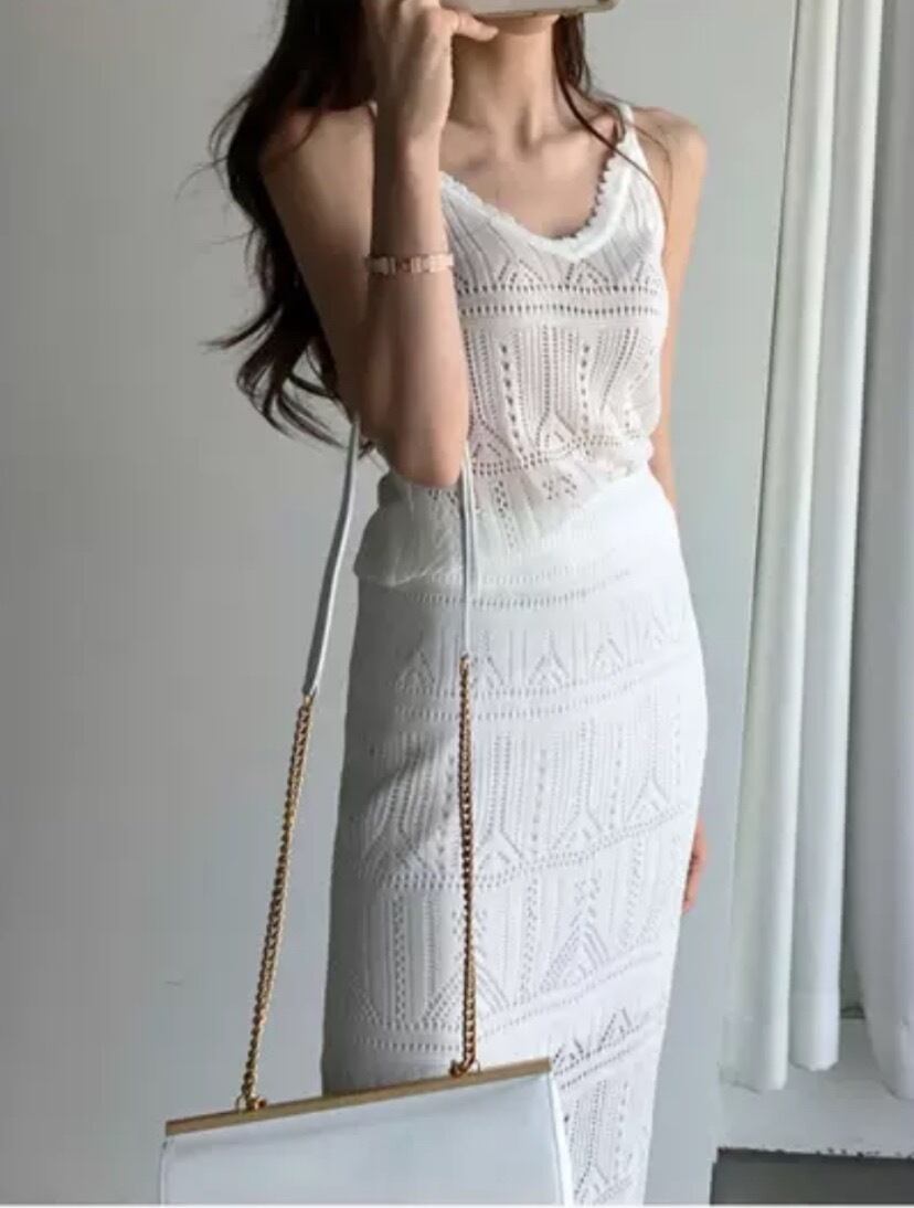 ワンピース レディース 春 夏 10代 20代 30代 40代 セクシー 大人可愛い きれいめ 大人女子 こなれ感 大人上品 おしゃれ お洒落 白 ホワイト ベージュ ミディアム丈 お出かけ イベント トレンド インスタ映え ニット タイト 細身 シンプル カジュアル サマーニット ノースリーブ 透け感 セクシー エレガント キャミソール スカート リゾート 旅行