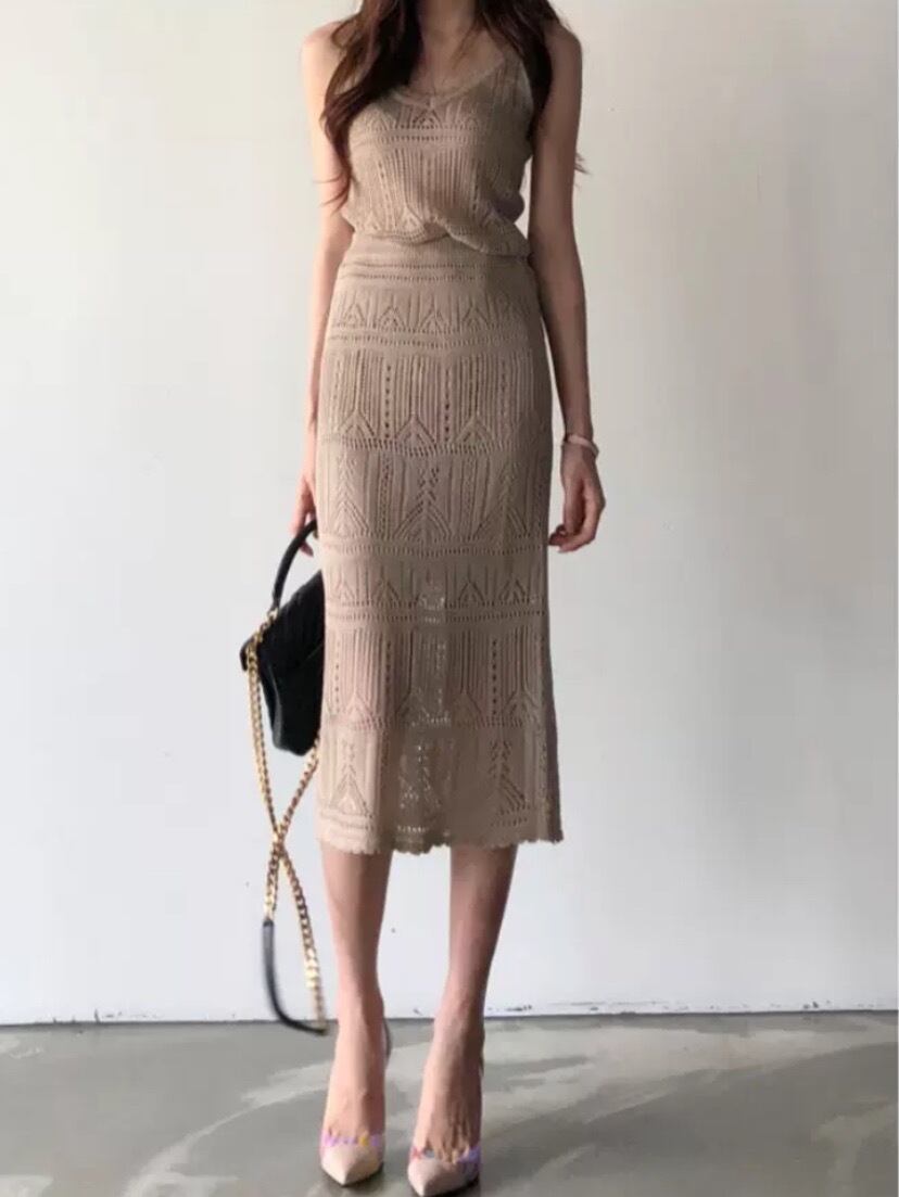 かぎ編みニットのキャミソールとスカートがセットになったワンピース風のツーピースセットです!!