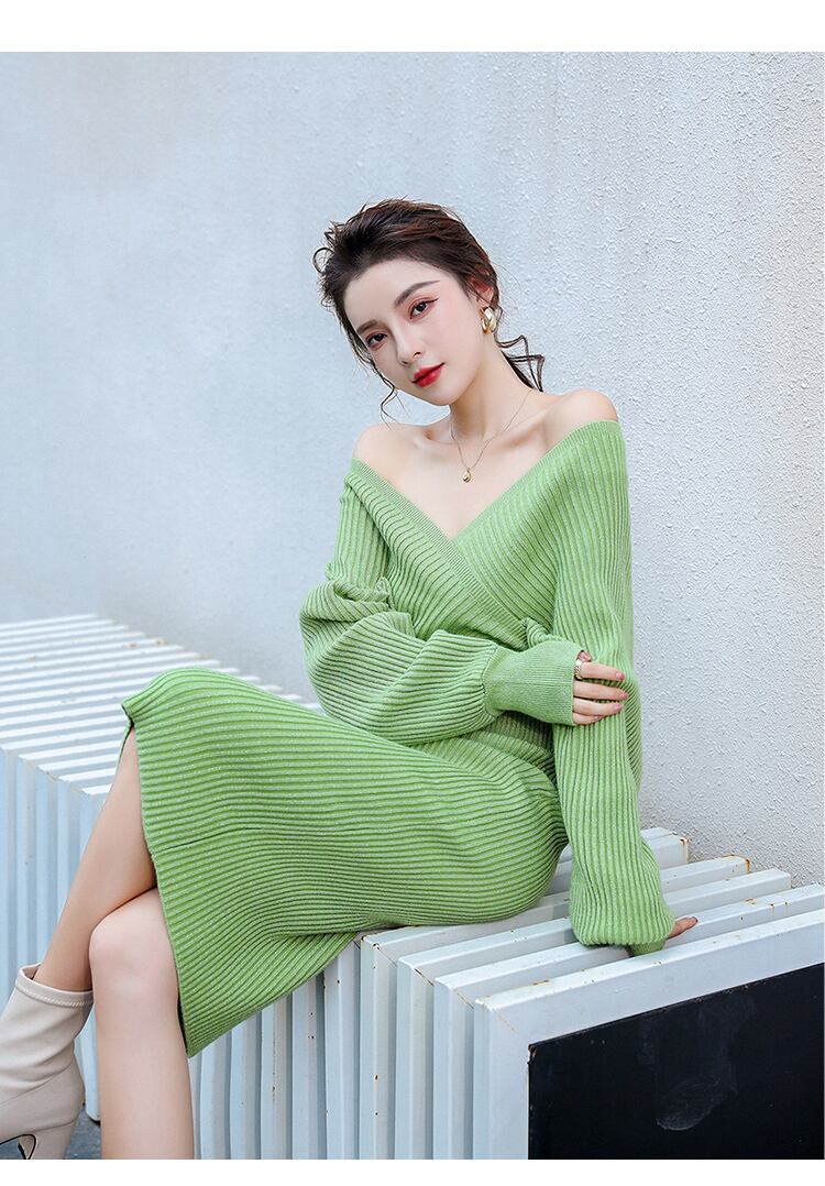 ワンカラー セットアップ 長袖 春 秋 冬 きれいめ カジュアル かわいい ロング フォーマル ニット ワンピ ペンシルスカート コクーンスカート タイトスカート ニットスカート 膝下 ミディアム丈 ミドル丈 ぽわん袖 バルーンスリーブ Vネック カシュクール スリム タイト 細身 ストレート 裾イン バックシャン バックコンシャス 背中魅せ ウエストマーク リブ リブニット 緑 グリーン S M L XL かわいい 大人可愛い きれいめ シンプル カジュアル 大人 上品 おしゃれ ナチュラル