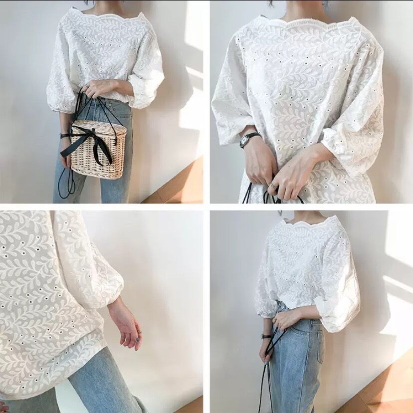 コットン スカラップボートネック ガーゼ リーフフラワー刺繍ブラウス!!