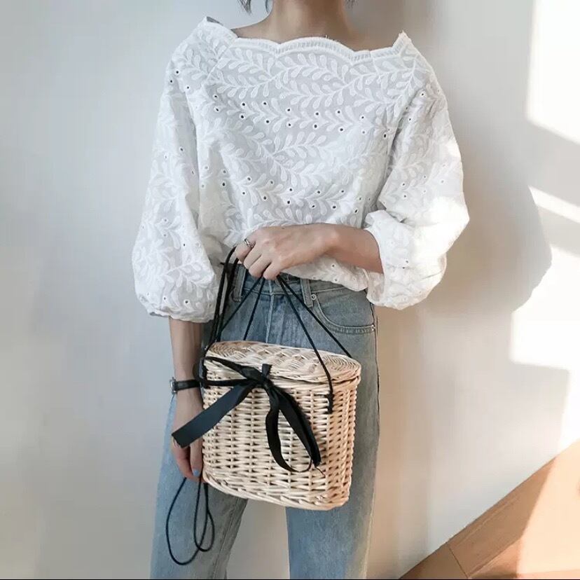 刺繍の入ったコットンレースのスカラップブラウス!!襟ぐりのスカラップが華やか♪さらりと着れて心地よく、カジュアルコーデにもピッタリの春夏のアイテムです!!!