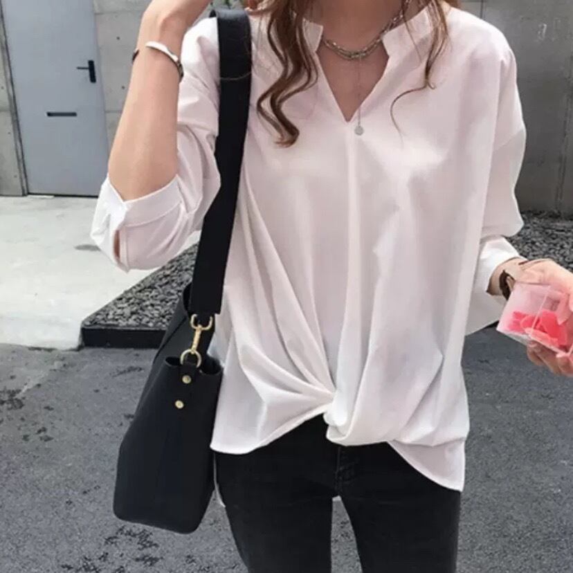 Vネックでデコルテラインを綺麗に見せてくれます。裾がまくられたデザインがオシャレポイントです!!サラッと着こなすだけで、さわやかきれいめスタイルに♪