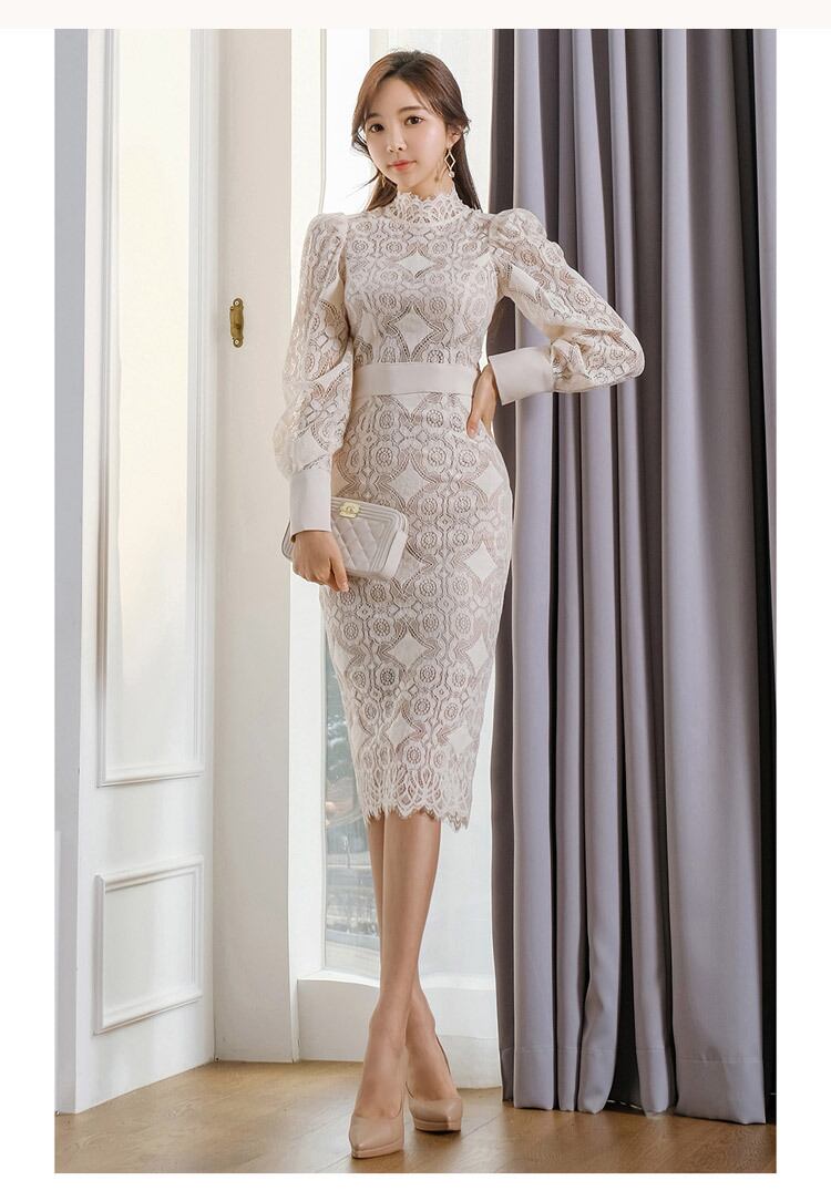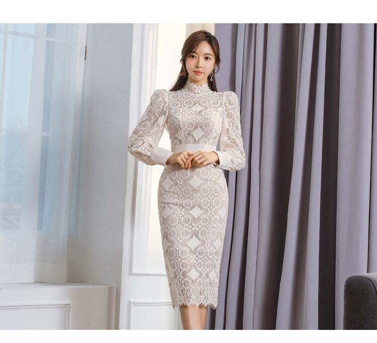レトロ風 ワンピース 長袖 春 夏 秋 冬 きれいめ カジュアル かわいい フォーマル ワンピドレス ペンシルスカート コクーンスカート タイトスカート 膝下 ミディアム丈 ミドル丈 ぽわん袖 パフスリーブ バルーンスリーブ スタンドカラー ハイネック ボトルネック レースカラー スリム タイト 細身 ストレート Iライン レース ベルト ウエストマーク 透け感 ベージュ S M L XL かわいい 大人可愛い きれいめ シンプル カジュアル 大人 上品 おしゃれ ナチュラル かっこいい レトロ 無地