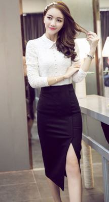 大胆なサイドスリットが施された、タイトなミドル丈スカート。