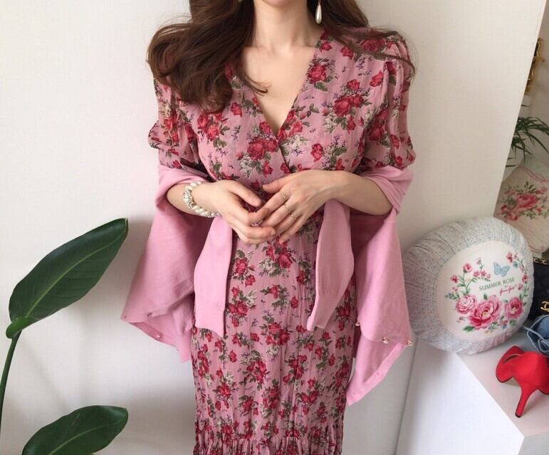 レトロ風 ワンピース 半袖 春 夏 秋 冬 きれいめ カジュアル かわいい フォーマル aライン Aライン フレア ワンピドレス ロング ロング丈 五分袖 ぽわん袖 パフスリーブ Vネック 深 Vネック スリム タイト 細身 ストレート マーメイド 切り替えデザイン プリーツ ウエストマーク ピンク S M L XL かわいい 大人可愛い きれいめ シンプル カジュアル 大人 上品 おしゃれ ナチュラル かっこいい レトロ 花柄 フラワー 韓国 韓国系 オルチャン 韓国ファッション 体型カバー 美脚