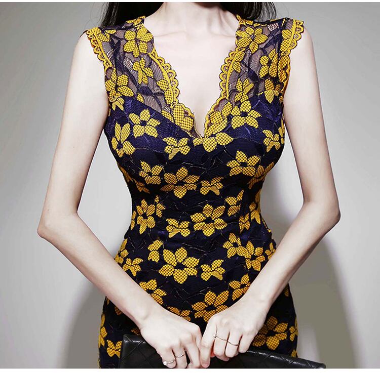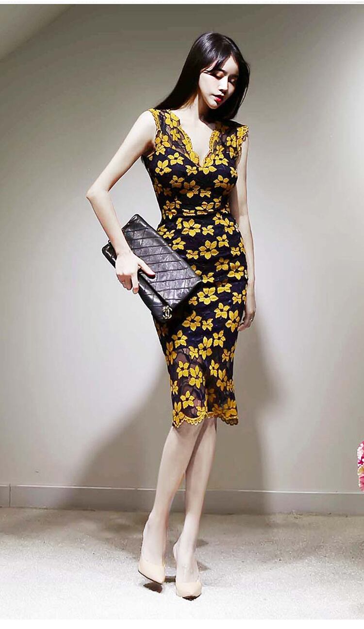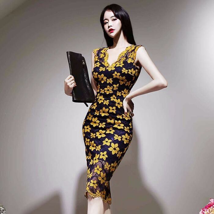 2色 レトロ風 ワンピース ノースリーブ 春 夏 秋 冬 きれいめ カジュアル かわいい フォーマル ワンピドレス ペンシルスカート コクーンスカート タイトスカート ひざ丈 膝下 ミディアム丈 ミドル丈 レース袖 Vネック 深 Vネック フリルカラー スリム タイト 細身 ストレート Iライン レース 刺繍 ウエストマーク 透け感 黒 ブラック イエロー S M L XL かわいい 大人可愛い きれいめ シンプル カジュアル 大人 上品 おしゃれ ナチュラル かっこいい レトロ 花柄 フラワー 韓国