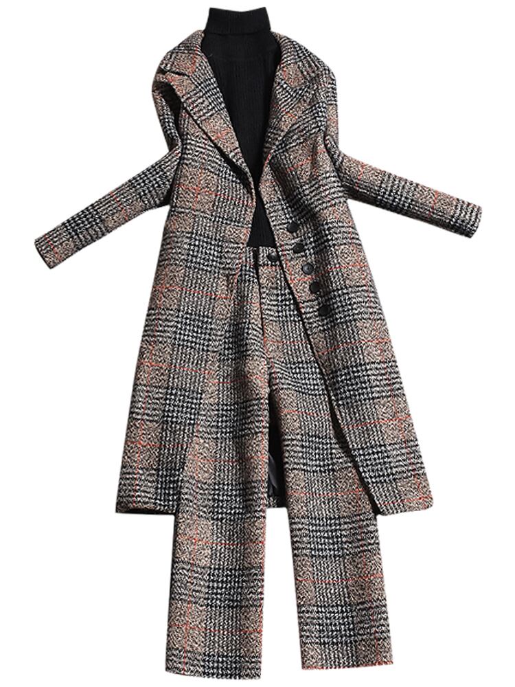 2色 レトロ風 セットアップ 長袖 春 夏 秋 冬 きれいめ カジュアル かわいい ロング フォーマル ストレートパンツ ロング ロング丈 Vネック 深 Vネック ピークドラペル スリム タイト 細身 ストレート 切り替えデザイン ウエストマーク ボタン シングルブレスト 灰色 グレー カーキ S M L かわいい 大人可愛い きれいめ シンプル カジュアル 大人 上品 おしゃれ ナチュラル かっこいい レトロ チェック柄 グレンチェック 韓国 韓国系 オルチャン 韓国ファッション 体型カバー 美脚