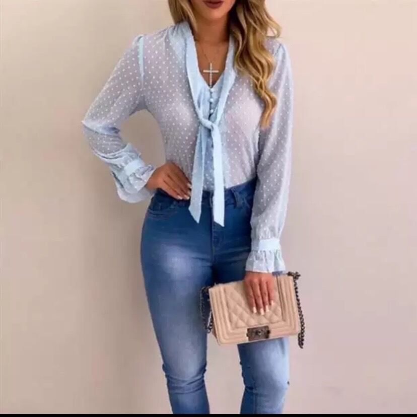 4色 レトロ風 トップス シャツ ブラウス チュニック 夏 春 秋 かわいい きれいめ カジュアル レギュラー丈 長袖 キャンディスリーブ ぽわん袖 ボウタイ スリム タイト 細身 ストレート 裾イン シフォン 前開き 透け感 シースルー 白 ホワイト 黒 ブラック 青 ブルー ピンク S M L XL 2XL 3XL 4XL 5XL かわいい 大人可愛い きれいめ シンプル カジュアル 大人 上品 おしゃれ ナチュラル かっこいい レトロ ドット柄 水玉 韓国 韓国系 オルチャン 韓国ファッション