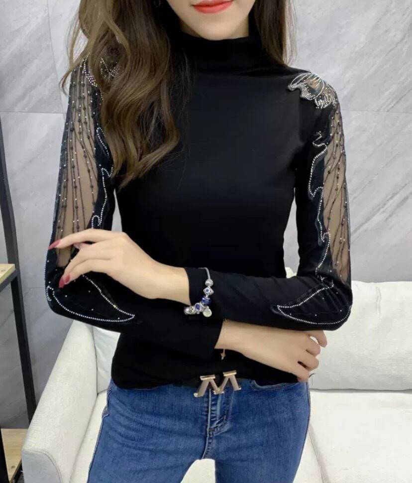 レトロ風 トップス シャツ ブラウス プルオーバー チュニック 夏 春 秋 かわいい きれいめ カジュアル レギュラー丈 長袖 スタンドカラー ボトルネック スリム タイト 細身 ストレート 裾イン 刺繍 透け感 シースルー パール 黒 ブラック M L XL 2XL 3XL かわいい 大人可愛い きれいめ シンプル カジュアル 大人 上品 おしゃれ ナチュラル かっこいい レトロ 無地 韓国 韓国系 オルチャン 韓国ファッション 体型カバー 定番 普段使い インスタ映え こなれ感 個性的 セクシー