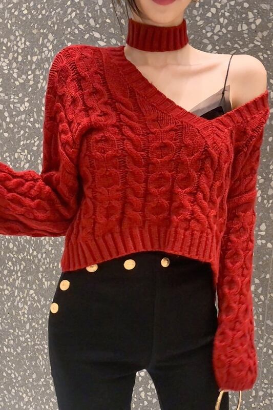 トップス ニット セーター レディース 秋冬 カジュアル ゆったり 厚手 ミニ ショート ショート丈 ミニ丈 ゆったり 長袖 ボリューム袖 萌袖 Vネック ホルターネック BIGシルエット もこもこ モコモコ 編み込み プルオーバー 赤 レッド 大人カラー 秋カラー ワンサイズ ビッグサイズ ゆったり かわいい 大人可愛い きれいめ シンプル カジュアル 大人 上品 おしゃれ ナチュラル かっこいい レトロ アジアン エスニック エキゾチック リラックス 無地 韓国 韓国系 オルチャン 韓国ファッション