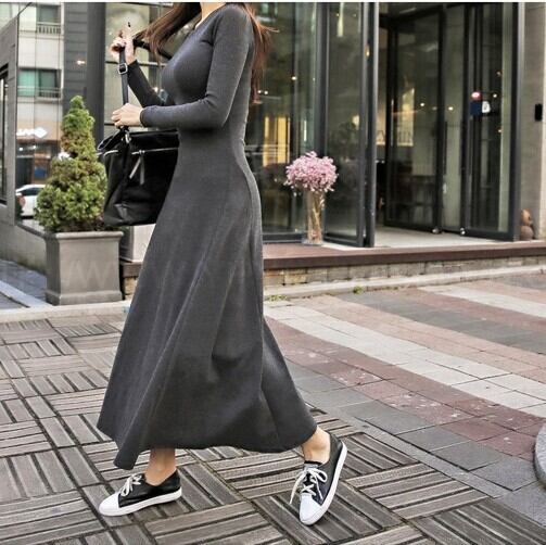 4色 ワンピース 長袖 春 秋 冬 カジュアル ロング aライン ニット ワンピ フレアスカート ロング丈 マキシ丈 9分丈 アンクル丈 ラウンドネック スリム 細身 ストレート Aライン 黒 赤 レッド 緑 グリーン 灰色 グレー S M L XL 2XL ジャスト シンプル カジュアル おしゃれ ナチュラル リラックス 無地 楽ちん 着回し 普段使い こなれ感 ラフ ガーリー 個性的 セクシー 抜け感 OL 通勤 学生 通学 ママコーデ デート お出かけ 公園デビュー 女子会