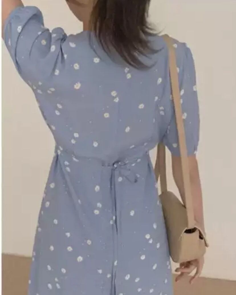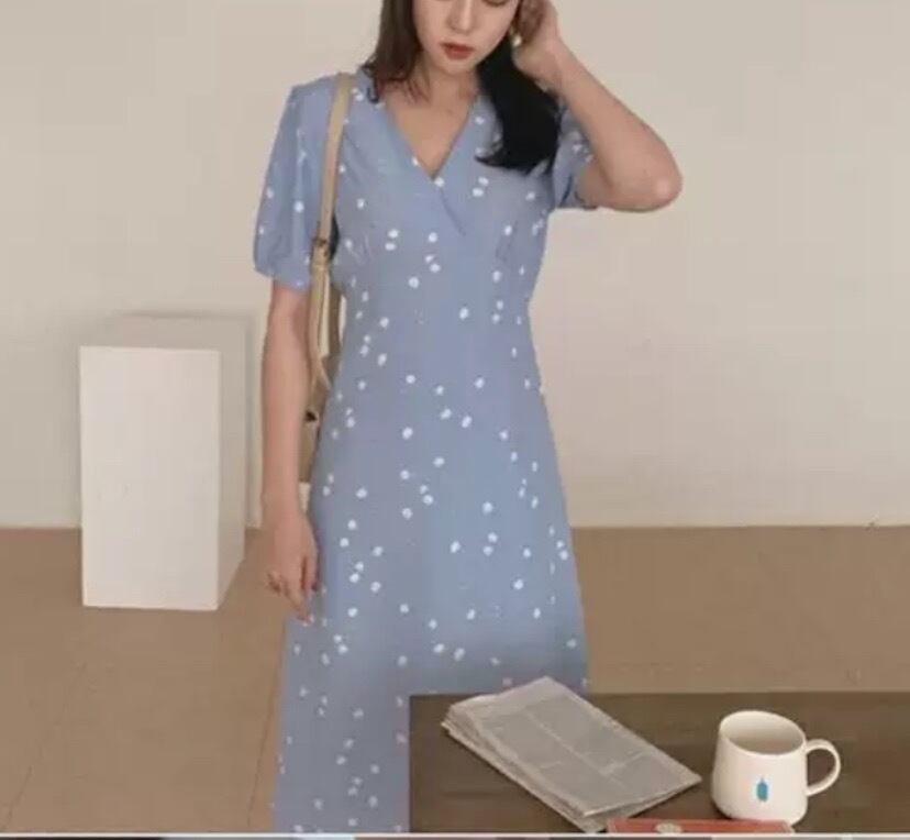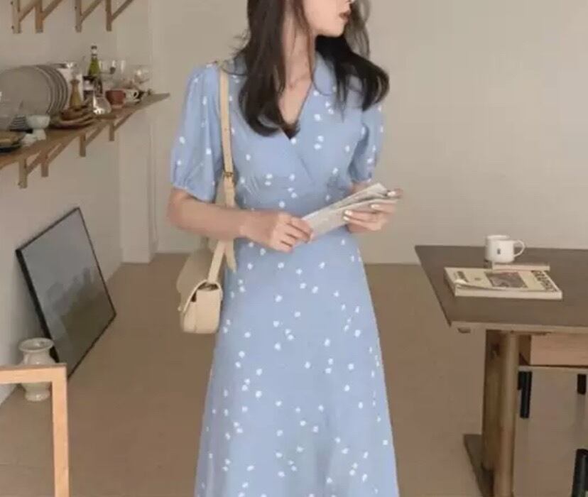 ワンピース 半袖 春 夏 きれいめ aライン Aライン フレア フレアスカート ミモレ丈 ミドル丈 Vネック カシュクール フレア Aライン スマート 青 ブルー S M L XL ジャスト かわいい 大人可愛い きれいめ シンプル 大人 上品 おしゃれ ナチュラル 柄 ドット柄 コーデ スタイル 楽ちん 着回し モテ インスタ映え こなれ感 ラフ ラブリー キュート ガーリー エレガント 抜け感 オフィス ビジネス OL 通勤 学生 通学 ママコーデ デート お出かけ 女子会