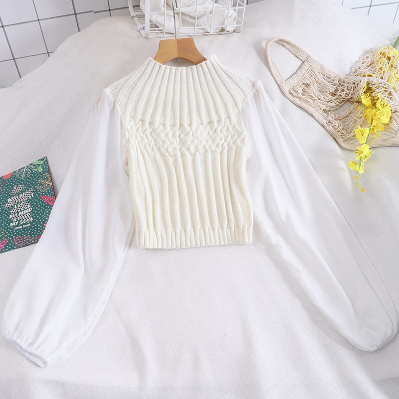 4色 トップス ニット セーター レディース 冬 春 秋 かわいい ゆったり ショート丈 長袖 ハイネック 切り替えデザイン ドッキング シフォン ふわふわ ケーブルニット リブニット 透け感 シースルー ボトミング 白 ホワイト 黒 ブラック ベージュ ピンク ワンサイズ フリーサイズ かわいい 大人可愛い きれいめ シンプル カジュアル 大人 おしゃれ 無地 着回し 暖かい モテ 普段使い 10代 20代 30代 キュート ガーリー 個性的 存在感 OL 通勤 学生 通学 デート お出かけ 女子会