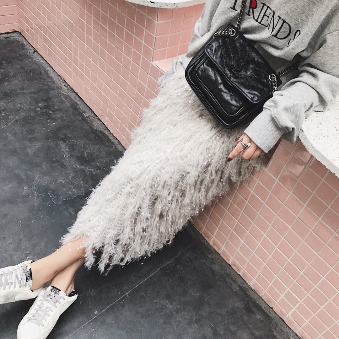 ふんわりとしたフェザーがあしらわれた、エレガントなロングスカート。