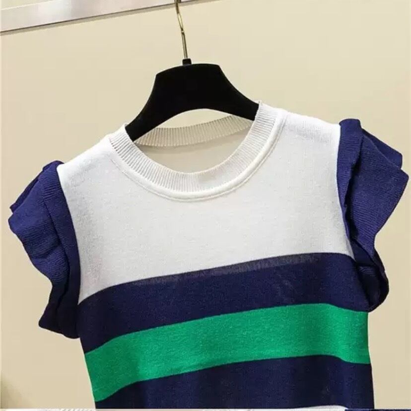 3色 トップス ニット セーター レディース 春 夏 カジュアル 半袖 フリル袖 ラウンドネック ストレート ホワイト ベージュ ネイビーブルー ワンサイズ ジャスト かわいい 大人可愛い シンプル カジュアル 大人 おしゃれ ボーダー コーデ スタイル 楽ちん 着回し モテ 普段使い 10代 20代 30代 こなれ感 ラフ ラブリー キュート ガーリー OL 通勤 学生 通学 デート お出かけ 公園デビュー 女子会 お泊まり リゾート 旅行 レストラン ショッピング 映画館 レディース 女性用 ママ