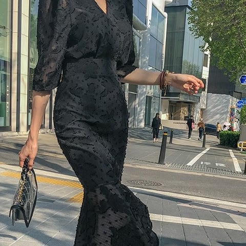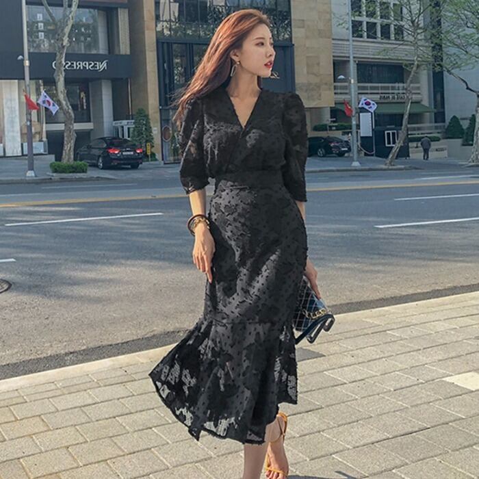 ワンピース レディース フィッシュテール ロング丈 シフォン 無地 Vネック フリル ロングスカート レース ハイウエスト 五分袖 袖あり 春 スプリング 女性 大人可愛い 可愛い かわいい カジュアル フェミニン おしゃれ お洒落 エレガント 上品 主役級 20代 女性用 日常使用 デイリーユース 通勤 オフィス オフィスカジュアル 社会人 OL デート ショッピング パーティー 女子会 お出かけ お泊り 旅行 4サイズ S M L XL ブラック 黒