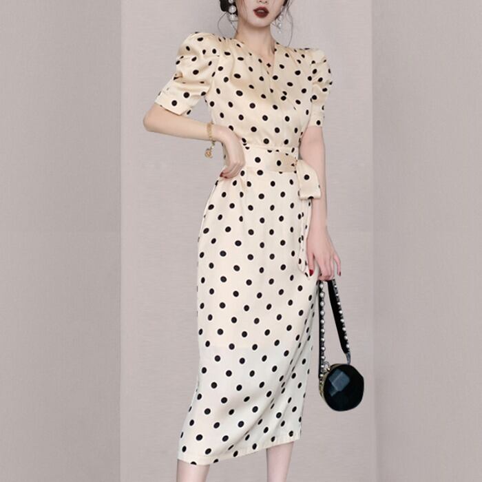 ワンピース 半袖 春 夏 きれいめ ロング タイトスカート 膝下 ミモレ丈 ロング丈 ぽわん袖 パフスリーブ 萌袖 ラウンドネック スリム 細身 ストレート Iライン スマート アプリコット S M L XL ジャスト かわいい 大人可愛い きれいめ シンプル 大人 上品 おしゃれ ドット柄 水玉 コーデ スタイル モテ 美脚 脚長 インスタ映え こなれ感 ラフ キュート セクシー エレガント 抜け感 オフィス OL 学生 デート お出かけ 女子会 お泊まり パーティー リゾート 旅行 海