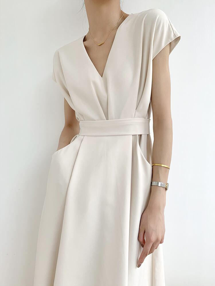 着痩せ効果抜群のワンピースです!!小顔効果もあるVネックとメリハリの出るウエストリボンが女性らしくエレガントです!!カーディガンを羽織ったり、ジャケットとの相性も抜群です♪