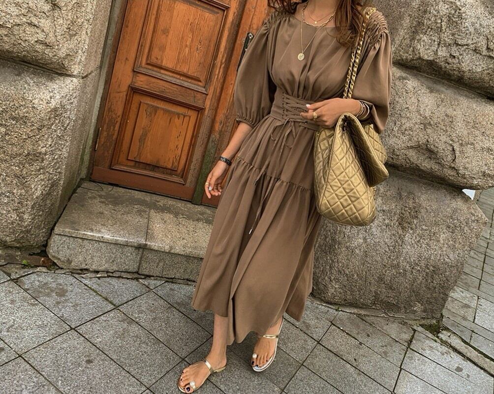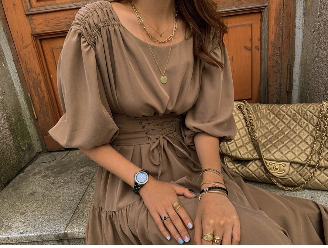 2色 ワンピース 半袖 春 夏 秋 きれいめ フレア フレアスカート 膝下 ミモレ丈 ボリューム袖 ラウンドネック ボートネック フレア セミフレア ウエストリボン ブラウン ネイビーブルー ワンサイズ ジャスト かわいい 大人可愛い きれいめ カジュアル 大人 上品 おしゃれ エキゾチック 無地 コーデ スタイル モテ インスタ映え こなれ感 ラブリー キュート ガーリー 抜け感 OL 通勤 学生 ママコーデ デート お出かけ 女子会 お泊まり 休日 ショッピング 映画館 シーズンレス レディース