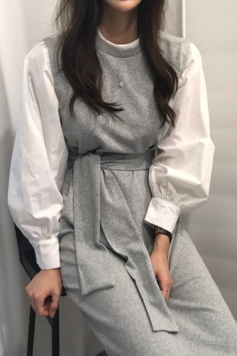 3色 ワンピース 長袖 秋冬 カジュアル シャツ付き シャツワンピース フレア 7分丈 ミディアム丈 ミドル丈 ぽわん袖 ボリューム袖 ボリュームスリーブ 袖コンシャス Uネック ラウンドネック 襟なし フレア セミフレア ウエストマーク ウエストリボン 黒 ブラック 茶色 ブラウン 灰色 グレー くすみカラー 大人カラー 春カラー 秋カラー ワンサイズ ゆったり ゆる かわいい 大人可愛い きれいめ シンプル カジュアル 大人 上品 おしゃれ ナチュラル かっこいい リラックス フェミニン 無地