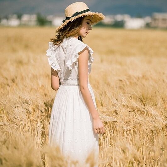 胸元と肩のフリルがエレガントなシルエットで大人の女性にぴったりです!!ふんわり広がるフレアのデザインは大人も着やすくよりリラックス感ありリゾートに最適です!!