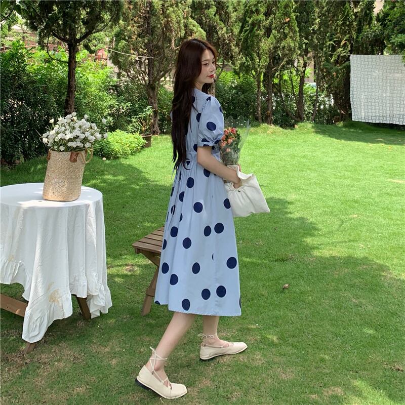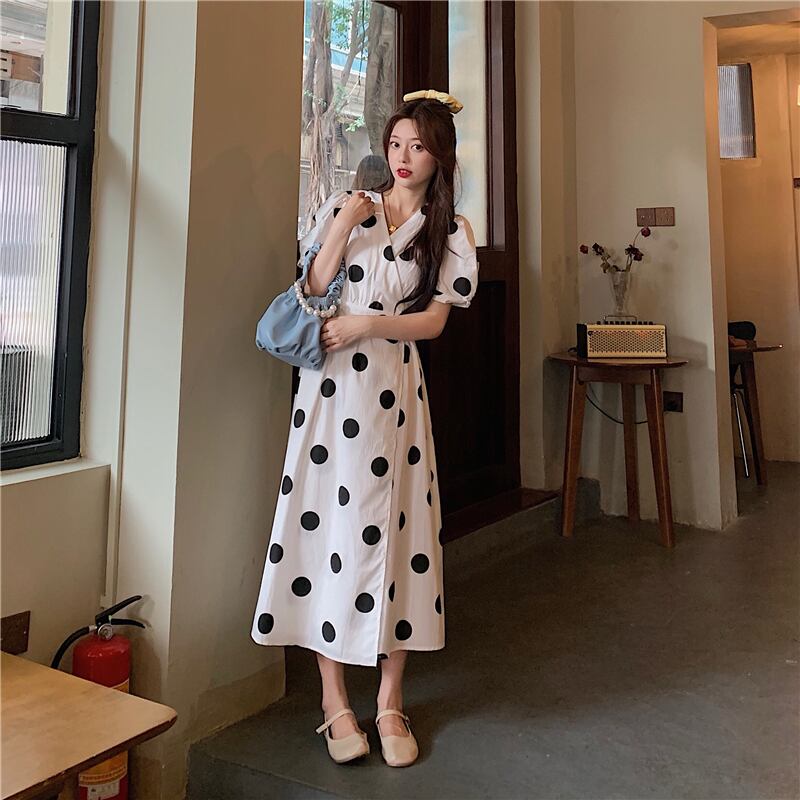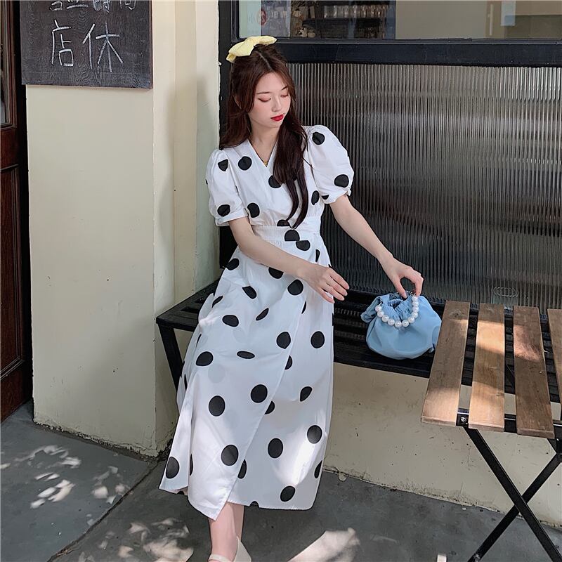 ワンピース レディース フレアスカート 膝下 ミモレ丈 パフスリーブ カシュクール Aライン ウエストマーク 大人可愛い レトロ ガーリー ドット柄 水玉 春 夏 10代 20代 30代 40代 着回し 普段使い 韓国 ファッション トレンド ワンサイズ