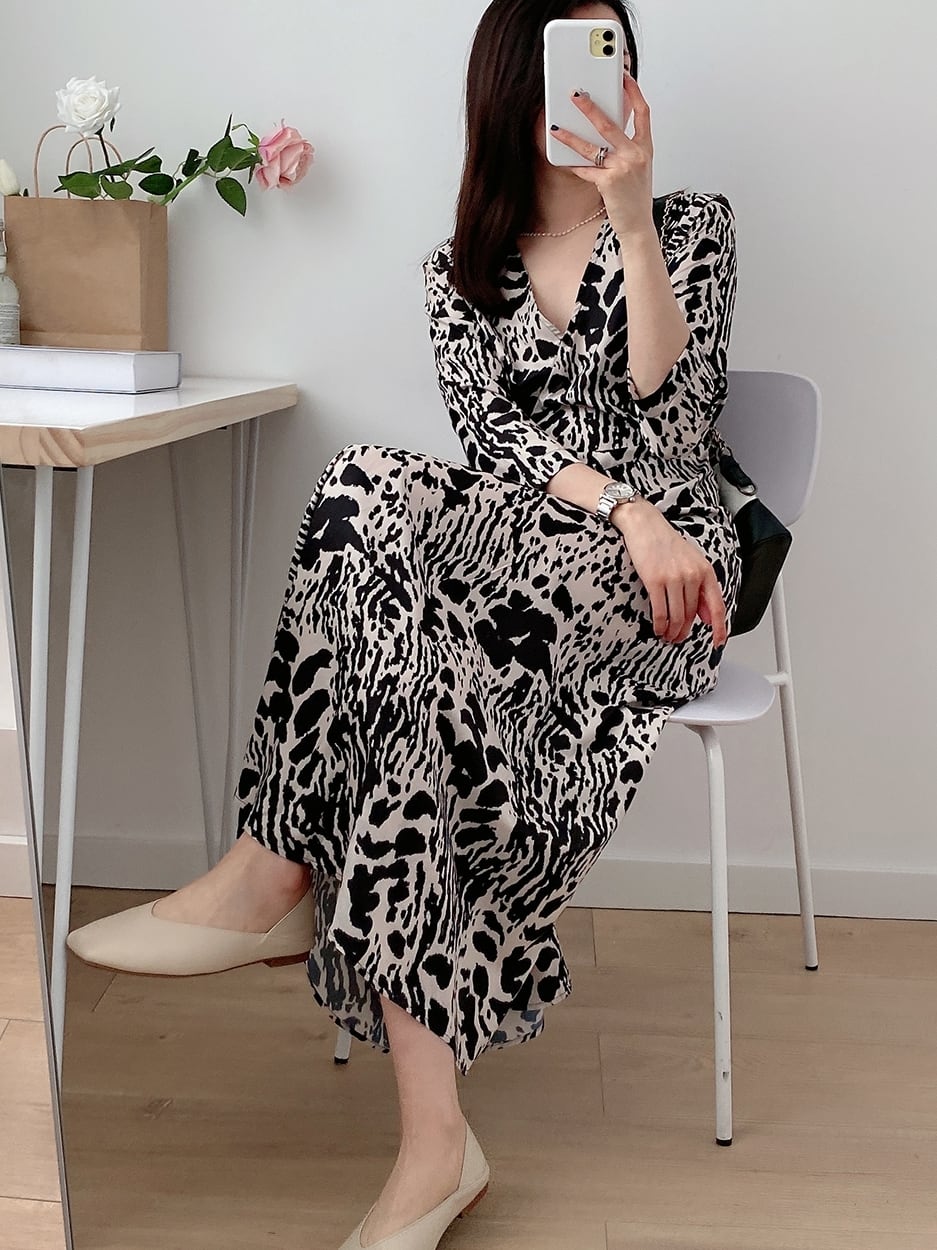 ワンピース 長袖 春 夏 春夏 きれいめ ロング aライン Aライン フレア ワンピドレス ロング丈 マキシ丈 Vネック 深 Vネック カシュクール スリム 細身 ストレート シフォン ハイウエスト 黒 ブラック S M L 大きい ゆったり ゆる カジュアル 大人 上品 おしゃれ フェミニン ゴージャス ヒョウ柄 レオパード 牛柄 アニマル柄 プリント 体型カバー 脚長 エレガント 主役級 存在感 とろみ感 高級感 派手 お出かけ パーティー イベント リゾート 旅行 20代 30代
